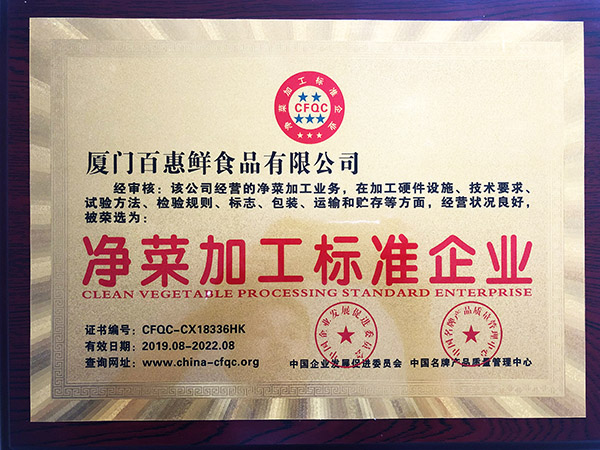 凈菜加工標準企業(yè)黃牌