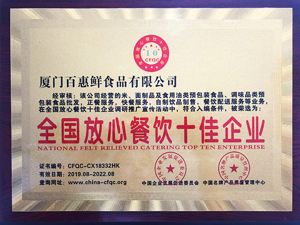 全國放心餐飲十佳企業(yè)黃牌